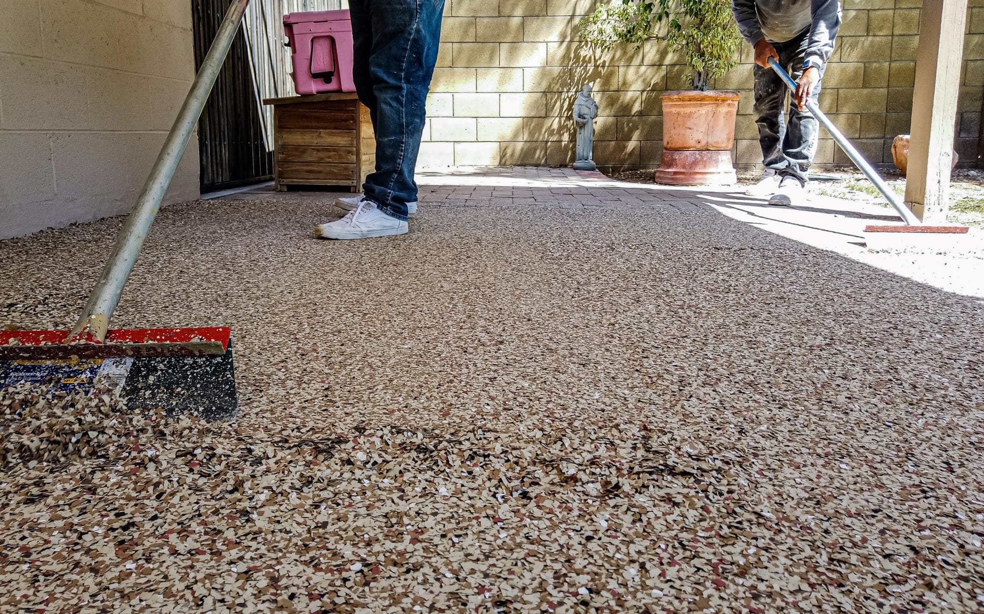 A polymer flake is generously hand broadcast providing even color & texture to the floor.